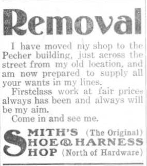 1914 - Jul 30 - D. H. Smith, the harness maker and shoe repairer, has rented the south half of the
