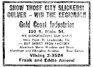 Gold Coast Industries in Culver, manufacturers of aluminum and "Fiberglas " awnings. A display