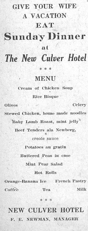 1931 - May 6, 1931 — New Culver Hotel offers Sunday dinners - soup, choice of fried spring chicken,