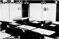 The interior of the building is paneled. and an antique motif is accented by a dozen Tiffany-style