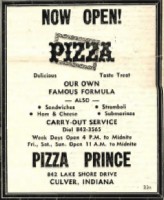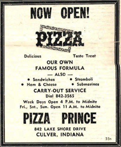 An Ad for Pizza Prince in the Culver citizen giving the location as 842 Lakeshore Dr.