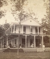 large two story club house, with veranda fronting the lake, elegant sleeping rooms above, reception