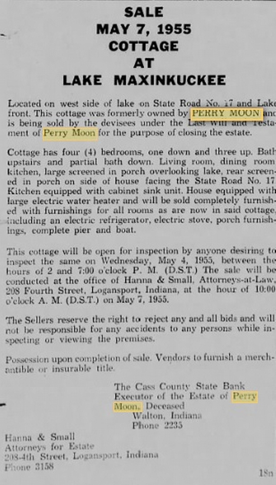 1955 - May 7 - SALE, MAY 7 1955 Cottage At Lake Maxinkuckee