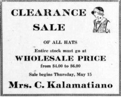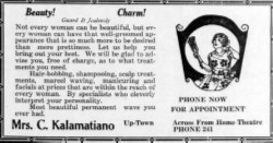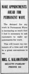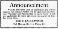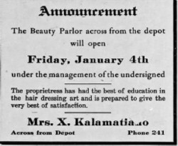 1925 - Dec 9 - Mrs. Kalamatiano moved her beauty parlor last week from the