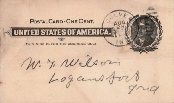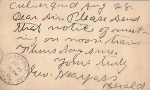 Post marked Aug 28, 1901 To W. T. Wilson, Logansport, Ind. Culver, Ind. Aug. 28 Dear Sir, Please send that notice of meeting on noon train Thursday sure. Your Truly Geo. Hearpass Hearld Stamped Recd'd Logansport, Ind. Aug. 28, 01, 1:30 PM