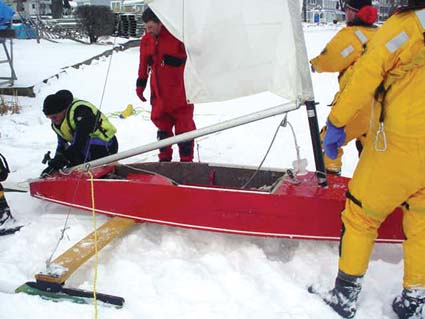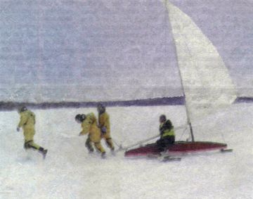 outing on the lake. An ice boat is similar to a sail boat, only that it runs on skis on top of the ice.