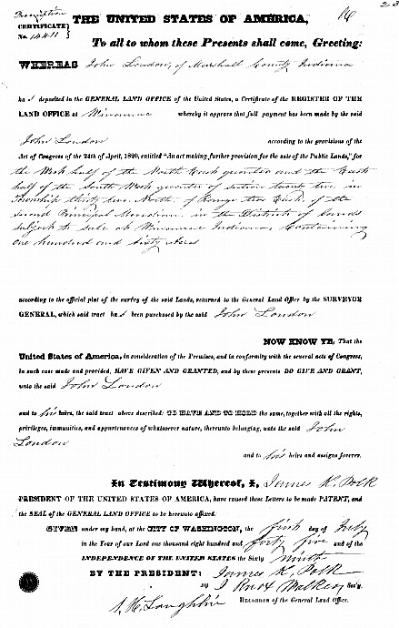 Whereas John London, of Marshall County Indiana has deposited in the General