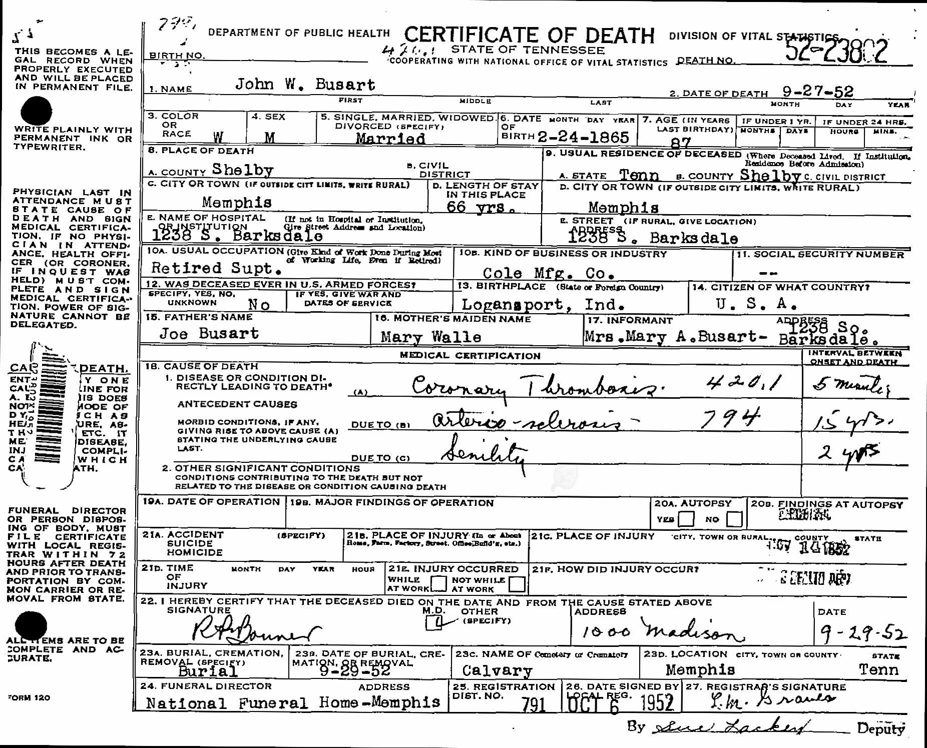 Joseph Busart Sr., Left This Vale of Sorrow and Woe, Monday January 26.