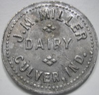 1" Aluminum token - stamped "J. M. Miller, Culver, Ind." with WITH "DAIRY"