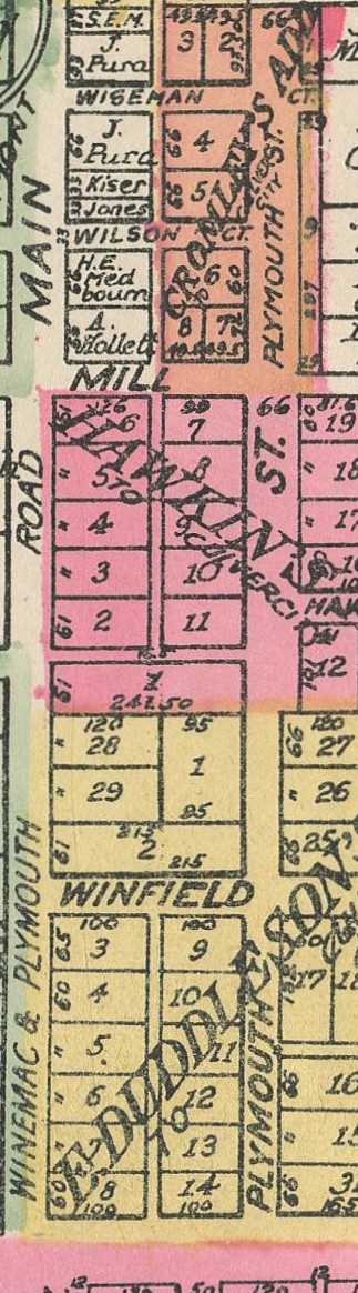 to Mill Street. Eighty to 100 loads of sand are being put in every day. The job is being done without drawing on the general fund - the street tax and donations of labor by individuals paying the expense. The marsh will soon be a thing of the past. It is gradually being filled up and built upon NOTE: 1908 plat map crop of roughly the area that was considered "the Marsh" |