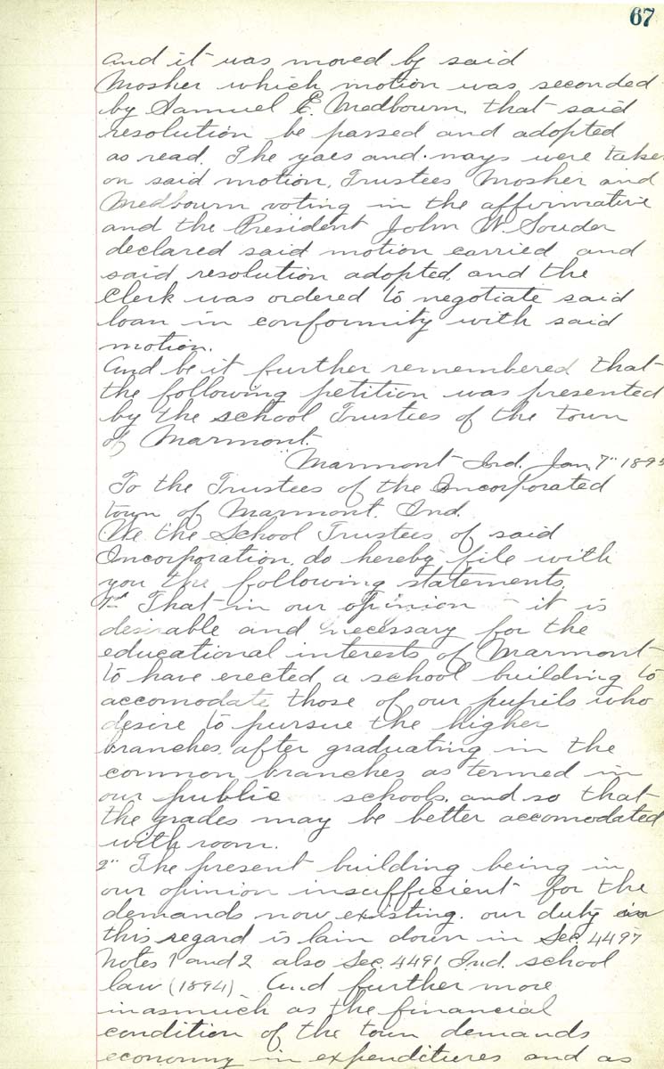 To the Trustees of the Incorporated town of Marmont Indiana We the School Trustees of said incorportation do hereby file with you the following statements 1st That in our opinion it is desireable and necessary for the educational intersest of Marmont to have erected a shool building to accomodate those of our pupils who desire to pursue the higher branches after grauating in the common branches as termed in our public schools and so that the grades may be better accomodated with room 2nd The present building being in our opinion insufficient for the demands now existing our duty in thes reagard is lain down in Sec. 4497 Notes 1 and 2 also Sec 4491 Ind. School law (1894). And further more in as much as the financial condition of the town demands economy in expenditures and as |