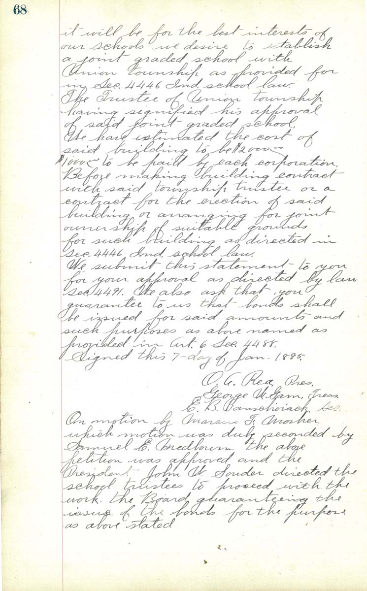 The Trustee of Union Township having signified by approval of said joint grade school. We have estiomated the cost of said building to be $2000.00 , $1000.00 to be paid by each corportation. Before making building contract with said township trustee of a contract or arranging for joint ownershio of suitable grounds for such building as directed in sec 4446 Indiana School law. We submit this statement to you for your approval as directed by law sec 4491. We also ask that you guarantee to us that bonds shalll be issued for said amount and such purposes as above names as provided in Art 6 Sec 4488. Signed this 7 day of Jan 1895 O. A. Rea, Pres George W Garn, Treas E. B. Vanshoiack, Sec. On motion of Marcus F Mosher which motion was duly seconded by Samuel E Medbourn the above petition was approved and the Presdient John W Souder directed the school trustees to proceed with the work. The board guaranteeing the issue of the bonds for the purpose as above stated |