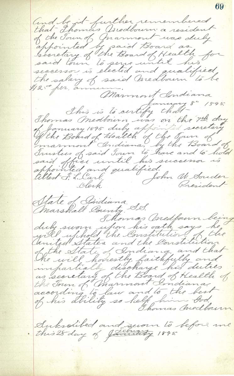 January 8th 1895 This is to certify that Thomas Medbourn was on the 7th day of January 1895 duly appointed secretary of the Board of Health of the Town of Marmont Indiana by the Board of Trustees of said Town to have and to hold said office until his successor is appointed and qualified. John W. Souder President Attest F. L. Carl Clerk State of Indiana, Marshall county, S.S. Thomas Medbourn being duly sworn upon his oath says he will uphold the Constitution of the United States and the Consititution of the State of Indiana and that he will honestly faithfully and impartially discharge his duties as secretary of the Board of Health of the Town of Marmont Indiana according to law and to the best of his ability so help him God. Thomas Medbourn Subscribed and sworn to before me this 28 day of February (january crossed out) 1895 |
