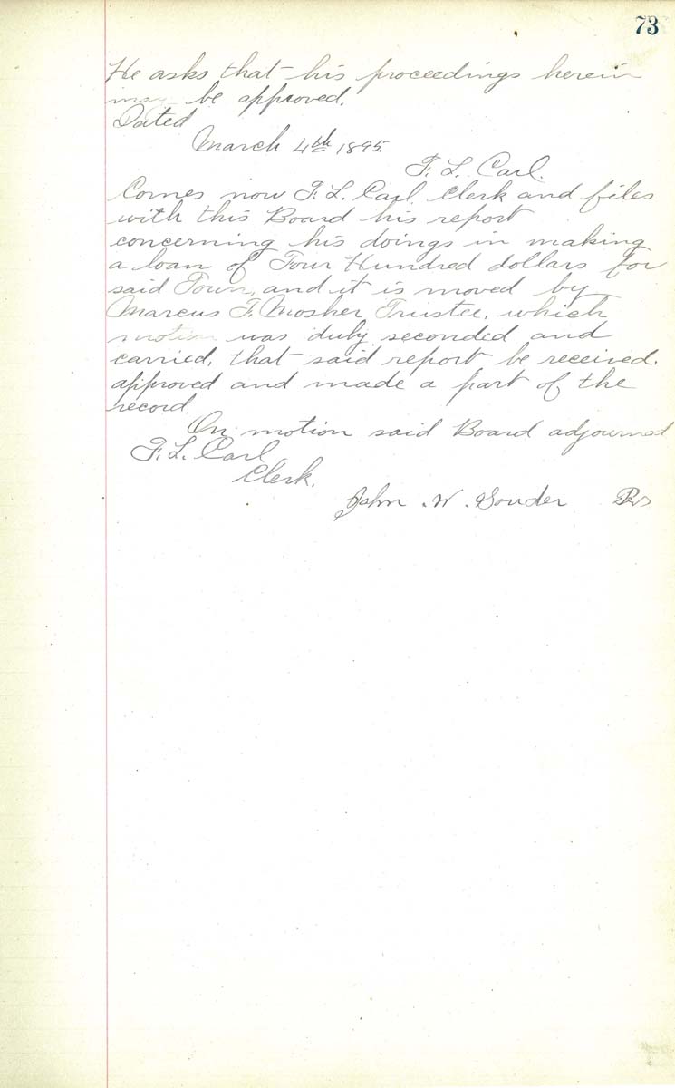 Dated March 4th 1895 F. L. Carl On motion said Bord adjorned F L Carl Clerk J. W. Souder Pres |