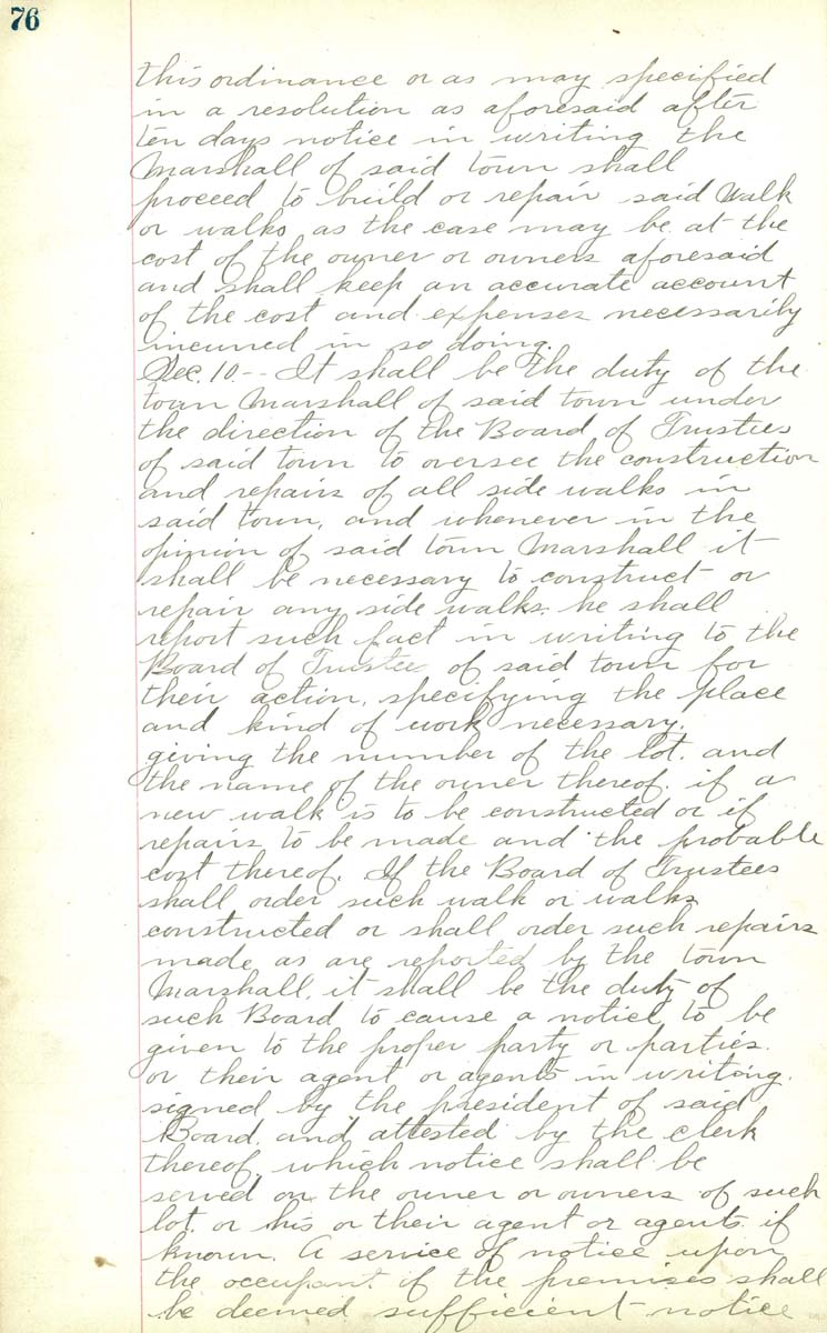 Sec 10 - - It shall be the duty of the town Marshall of said town under the direction of the Board of Trustees of said town to oversee the construction and repairs of all side walks in said town, and whenever in the opinion if said town Marshall it shall be necessary to construct of repair any side walks he shall report such fact in writing to the Board of Trustees of said town for their action specifying the place and kind of work necessary. giving the number of the and the name of the owner thereof it a new walk is to be constructed or if repairs to be made and the probable cost thereof. If the Board of Trustees shall order such walk or walks constructed or shall order such repairs made as are reported by the town Marshall it shall be the duty of such board to cause a notice to be given to the proper party or parties or their agent or agents in writing. signed by the president of said Board and attested by the clerk thereof which notice shall be served on the owner or owners of such lot or his or their agent or agents if known. A service of notice upon the occupant of the premises shall be deemed sufficient notice |