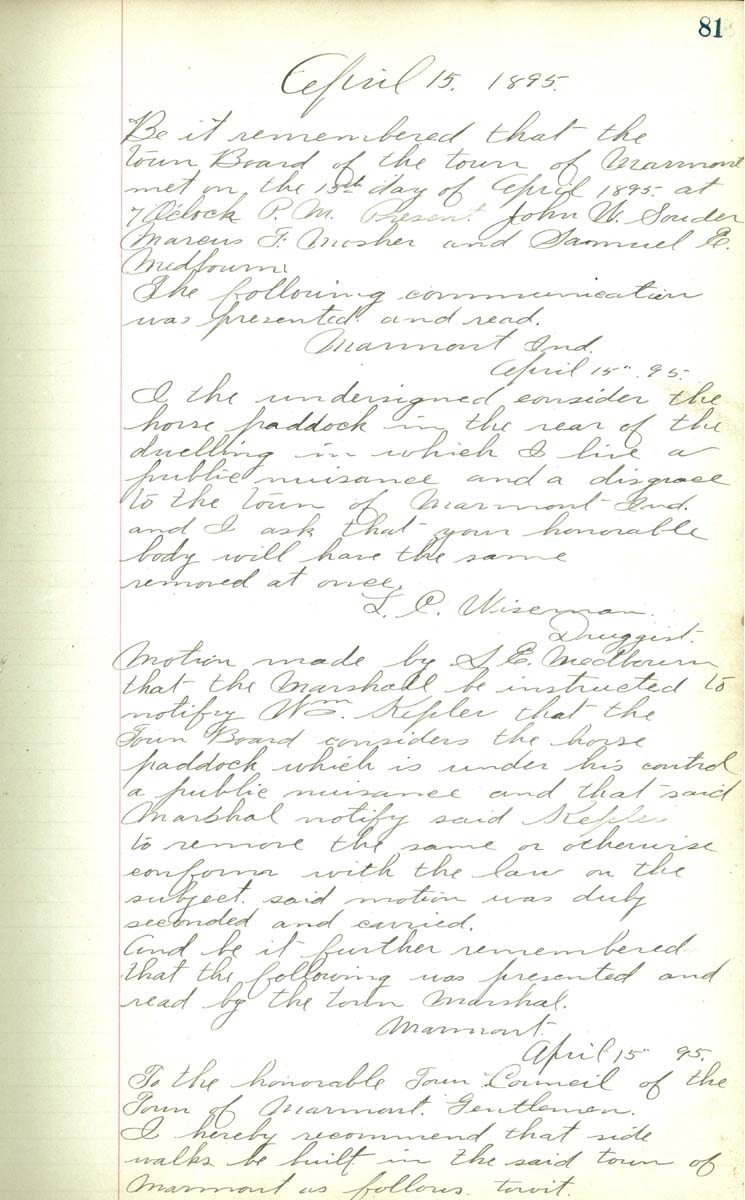 April 15 1895 I the undersigned consider the horse paddock in the rear of the dwelling in which I live a public nusance and a disgrace to the town of Marmont Indiana and I ask that you honrable body will have the same removed at once. L. C. Wiseman Druggist And be it further remembered that the following was presented and read by the town Marshal