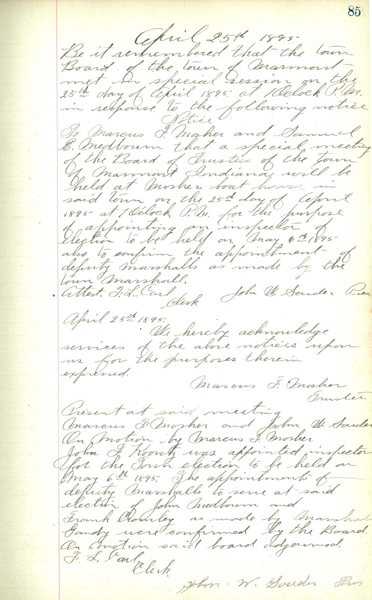 To Marcus F Mosher and Samuel E Medbourn that a special meeting of the Board of Trustees of the town of Marmont Indiana will be held at Mosher boat house in said town on the 25th day of April 1895 at 1 O'clock P.M. for the purpose of appointing an inspector of elecetion to confirm the appoinment of deputy marshalls as made by the town marshall. Attest F. L. Carl, Clerk John W. Souder Pres April 25th 1895 We hereby acknowledhe sevices of the above notices upon us for the purposes there in expressed Marcus F Mosher, Trustee Present at said meeting Marcus F Mosher and John W Souder On Motion by Marcus F Mosher John F Koontz was appointed inspector for the Town election to be held on May 6th 1895. The appointments of deputy Marshalls to seve at said election of John Medbourn and Frank Cromley as made by Marshall Gandy were confirmed by the Board On motion said board Adjourned. F L Carl, Clerk John W. Souder Pres |