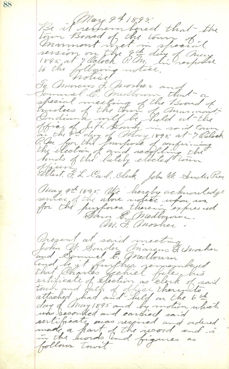 To Marcus F. Mosher and Samuel E Medbourn that a special meeting of the Board of trustees of the town of Marmont Indiana will be held at the office of J. H. Koontz in said town on the 9th day of May 1895 at 7 o'clock P.M. for the purpose of confirming the election of and accepting the bonds of the lately elected town officers. attest F. L. Carl Clerk John W. Souder Pres May 9th 1895 We hereby acknowledge service of the above notice upon us for the purpose there in expressed Sam E Medbourn M. F. Mosher Present at said meeting John W. Souder Marcus F Mosher and Samuel E Medbourn And be it remembered that Charles Zechiel file his certificate of election as clerk of said town and oath of office therein to attached had and held on the 6th day of May 1895 and by motion which was seconded and carried said certificate was received and ordered made a part of the record and is in the words and figures as follows towit |