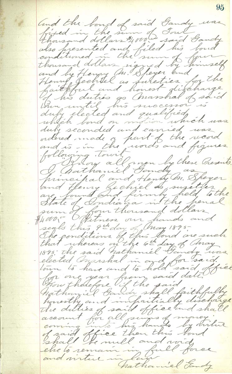 Witness our hands and seals this 9th day of May 1895 The conditions of this bond are such that wereas on the 6th day of May 1895, the said Nathaniel Gandy was elected Marshall in and for said town to have and to hold said office for one year from said date Know therefore if the said Nathaniel Gandy shal faithfull honesty and impartially discharge the duties of said office and shall account for all sums of money coming into his hands by virtue of said office then this bond shall be null and void esle to remain in full force and virtue in law Nathaniel Gandy |