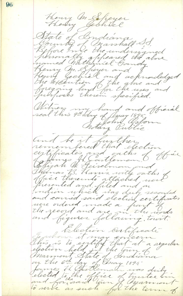 Hemry M Speyer Henry Zechiel State of Indiana County of Marshall S.S. Before me the undersigned personally appeared the above Nathaniel Gandy Hemry M Speyer and Henry Zechiel and acknowledged the execution of the above and foregoing boad for the uses and purposes there in specified. Wilness my hand and offical seal this 9th day of May 1895 John Osborn Notary Public And be it further rememberd that elction certifiated and oaths of office of James H. Castleman, Elijiah W. Geisleman and Thomas B Harris with oaths of office thereunto atached were preneted and filed and on motion which was duly recorded and carried made a part of the record and are in the words and figures following towit