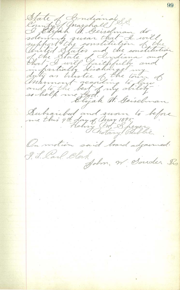 I Elijah W. Geiselman do solemenly swear that I sill support the consitution of the United State and the constitution of the State Indiana and that I will faithfully and impartially discharge my duty as trustee of the town of Marmont according to law and to the best of my ability so help me God Elijah W. Geiselman Subscribed and sworn to before me this 9th day of May 1895 Henry A Speyer Notary Public On motion said board adjourned F. L Carl Clerk John W. Souder Pres. |