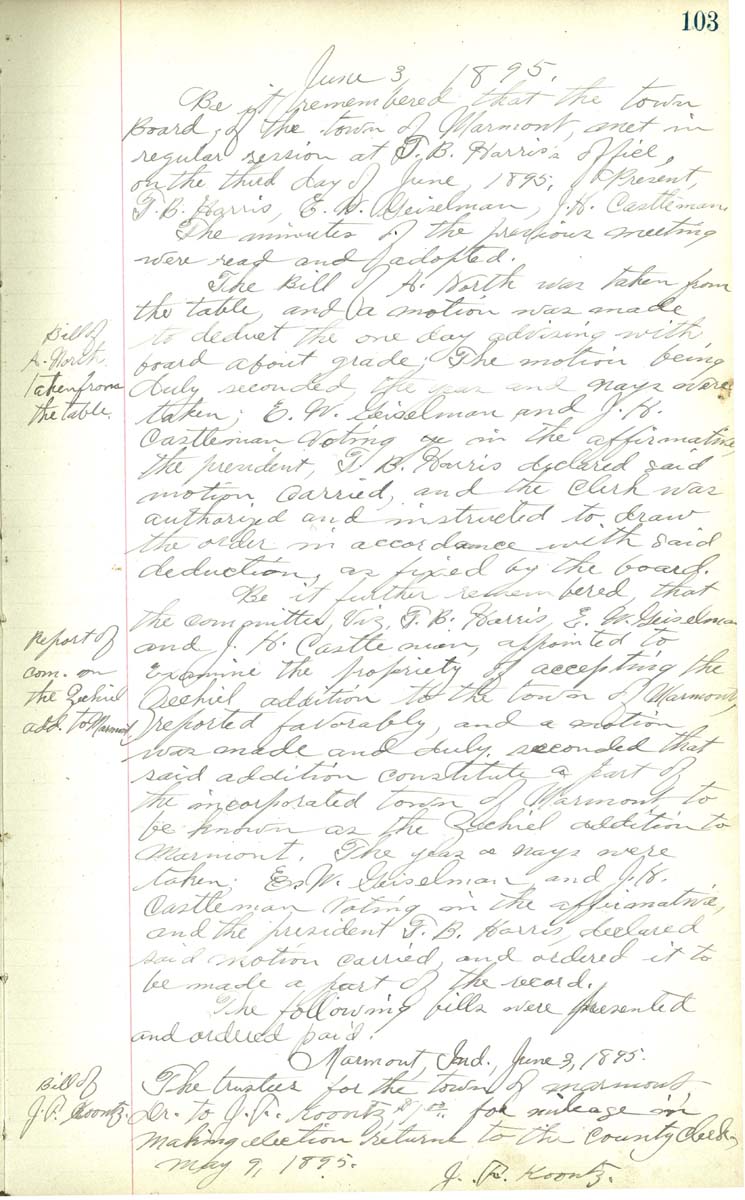 June 3 1895 Be it rememebred that the town Board, of the town of Marmont, met in regular session at T. B. Harris office, on the third day of Jun 1895. Present T. B. Harris, E. W. Geiselman, J. H. Catleman. The minutes of the previous meeting were read and adopted. The bill of A. North was taken from the table and a motion was made to deduct the one day advising with board about grade. The motion being duly seconded the yeas and nays were taken; E. W. Geislamn and J. H. Castleman voting in the affirmative; the president T. B. Harries declared said motion carried, and the clerk was authorized and instructed to draw the order in accordance with said deduction, as fixed by the board Be it further rememebred that the committee viz T. B.Harris, E E. Geislamdn and J. H. Castleman appointed to the examine the propriety of accepting the Zechiel addition to the Town of Marmont reported favaorably, and a motion was made and duly seconded that said addition constitute a part of the incoporated town of Marmont to be known as the Zechiel addition to Marmont. The yeas and nays were taken. E. W. Geislaman and J. H. Castleman and the president T. B. Harris, declared said motion carried and ordered it to be made a part of the record. The following bills were presented and ordered paid