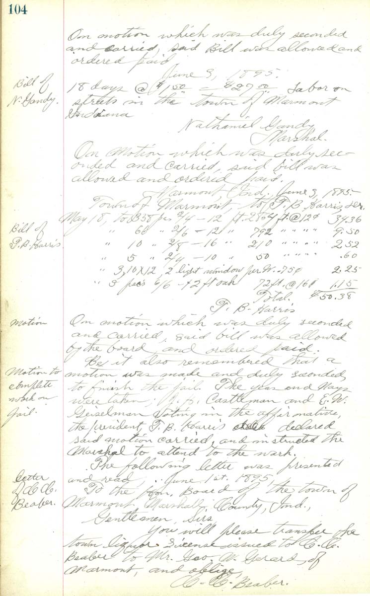 On which motion was duly seconded and carried, said bill was allowed and ordered paid June 3, 1895 18 days @ $1.50 = $27.00 Labor on streets in the town of Marmont Indiana Nathaniel Gandy, Marshall On which motion was duly seconded and carried, said bill was allowed and ordered paid. Marmont Ind. Jue 3, 1895 Town of Marmont, to T. B. Harris Dr