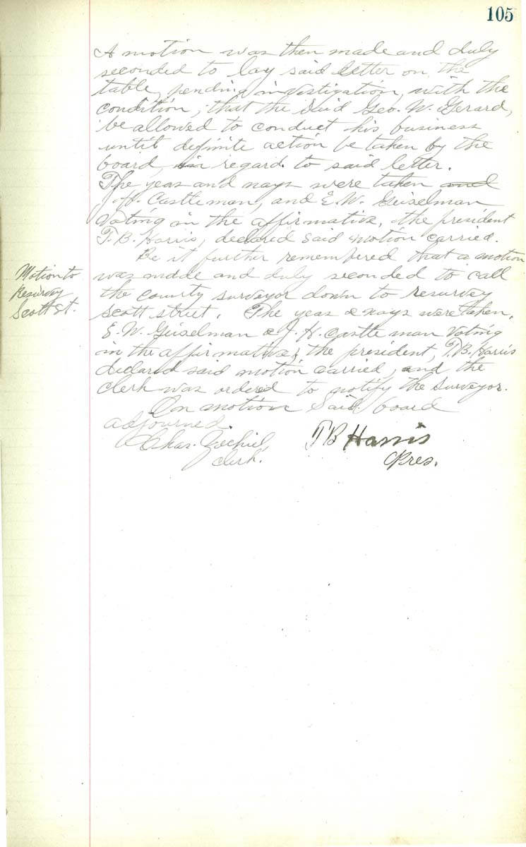 the board in regard to daid letter The yeas and nays wer taken J. H. Castleman and E. W. Geisleman voting in the affirmative, the president T. B. Harris, declared said motion carried Be it further remembered that a motion was made and duly seconded to call the county surveyor down to resurvey Scott Street. The yeas and nays were take n. E. W. Geilsman & J. H. Castleman voting in the affirmative, the president T. B. Harris declared saidn motion carred and the clekt was ordered to notify the surveyor On motion said board adjourned. Chas Zechiel clerk T. B. Harris Pres. |