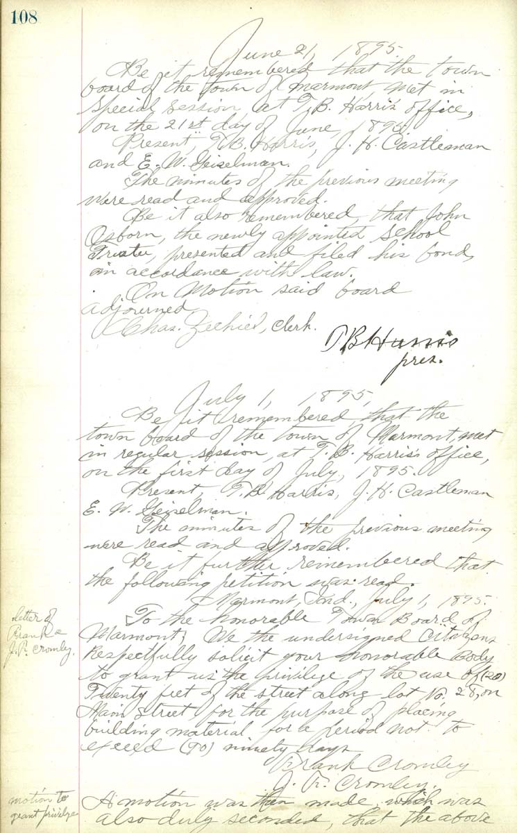 June 21 1895 Be it remembered that the town board of the town of Marmont met in special session at T. B. Harris office on the 21st day of June 1895. Present T. B. Harris, J. H. Castleman and E. W. Geiselman The minutes of the precious meeting were read and approved Be it also rememebered that John Osbonr, the newly appointed school Trustee, presented and filed his bond, in accordance with law On motion said board adjourned Chas Zechiel, Clerk T. B. Harris, Pres July 1 1895 Be it rememebered that the town board of the town of Marmont met in rugular session, at T. B. Harris office on the first day of July 1895 Present T. B. Harris, J. H. Castleman and E. W. Geiselman The minutes of the previvous meeting were read and approved Be it further rememebred that the following petition was read