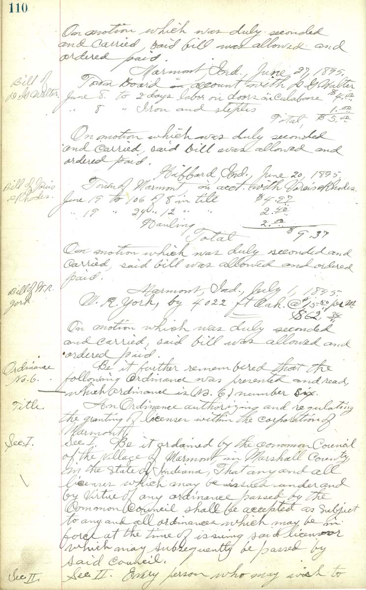 On motion which was duly seconded and carried, saird bill was allowed and ordered paid Marmont, Ind. July 1, 1895 W. R. York, by 4022 ft Oak @ $15.00 per __ $62.43 On motion which was duly seconded and carried, saird bill was allowed and ordered paid An ordiance authorizing and regulating the granting of licenses within the corporation of Marmont.