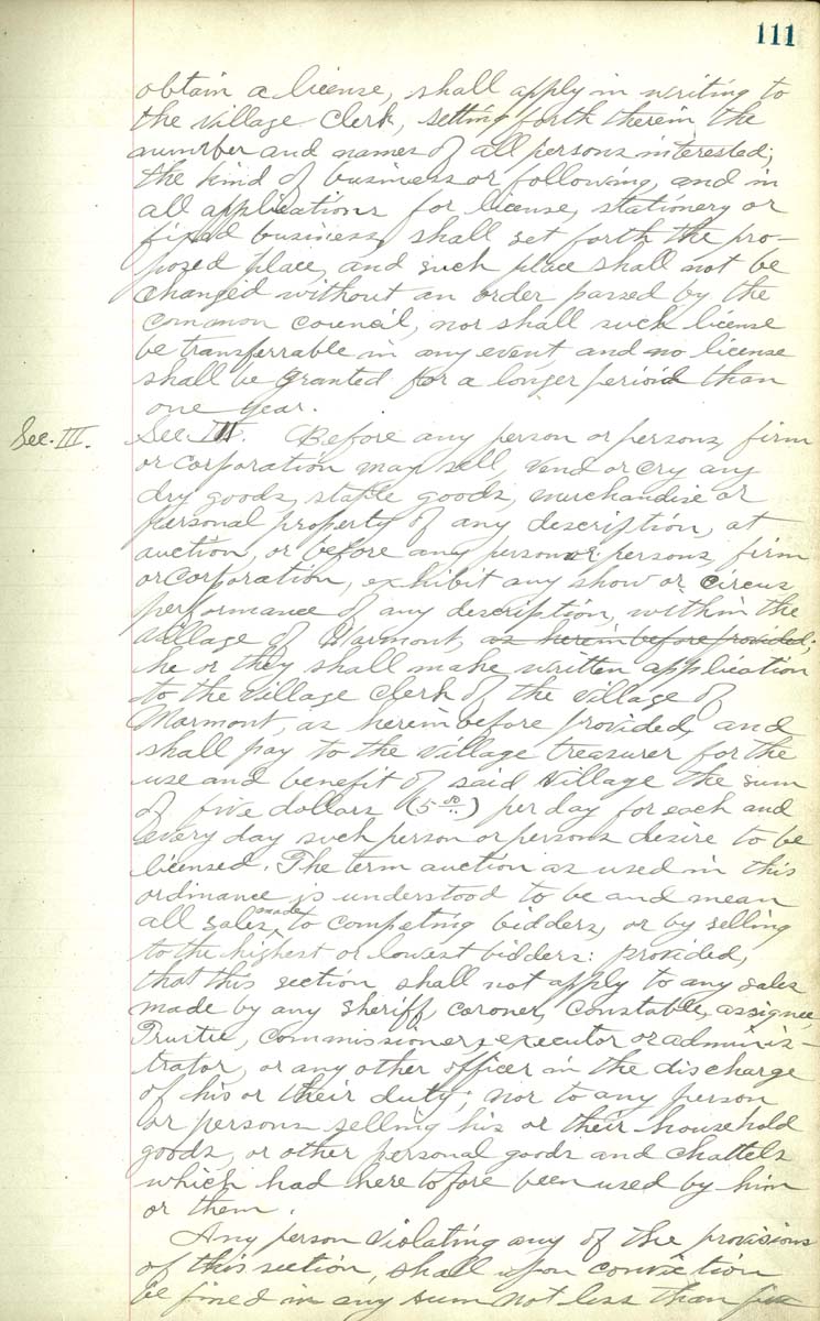 Sec III Before any person or persons, firm or corporation may sell, vend or cry any dry goods, staple goods, mechandise or personal property of any description, at auction, or before any person or persons, firm or corporation, echibit any shor or circus performance of any description, within the village of Marmont, Any person violating any of the provisions of this section, shall from conviction be fined in any sum not less than five |