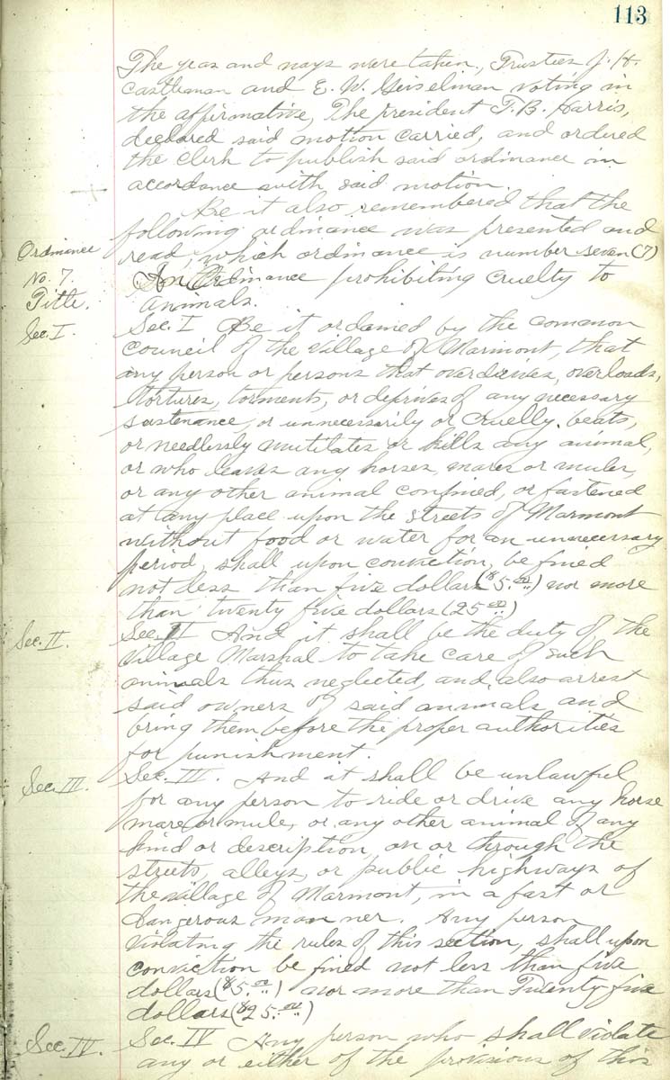 Sec. I Be it ordained by the common Council of the village of Marmont, that my person or persons that overdirives, overloads, tortures, torments, or deprives of any necessary sustance, or unncessarily or cruelly beats or neddlessly mutilated or kills any animal or who causes any horses mares or muels or any other animal confined or fastened at any place upon the streets of Marmont without food or water for an unnecessary period shall upon convition be fined not less than five dollars ($5.00) and not more than twenty five dollars (25.00) Sec II And it shall be the duty of the village Marshall to take core of such animals thus neglected, and also arrest said owners of said animals and bring them before the proper authorities for punsihment Sec II And it shall be unlawful for any person to ride or drive any horse mar or mule or any other animal of any kind or discription on or through the streets, alleys, or public highways of the village of Marmont, in a fast or dangerous manner. Any person violating the rules of this section shall upon convition be fined not less than five dollars ($5.00) and not more than twenty five dollars ($25.00) Sec. IV Any person who shall violate any or eithe of the provisions of this |