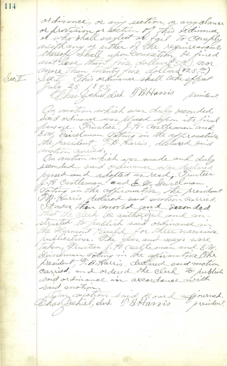 Sec V This ordinance shall take effect July 25, 1895 Chas. Zechiel Clerk T. B. Harris president. On motion which was duly seconded said ordinance was placed upon its final passage. Trustees J. H. Caslteman and E. W. Geiselman voting in the affirmatiive the president, T. B. Harris, declared said motion carried On motion which was made and duly seconded said ordinance was ceclared passed and adopted as read; Trustees J. H. Castleman and E. W. Geislman voting in the affirmatiive the president, T. B. Harris, declared said motion carried It was then moved and seconded that the clerk be authorized and instructed to publish said ordinance in the Marmont Heral for thee successive publications. The yeas and nays were taken Trustees J. H. Castleman and E. W. Geiiselman voting in the affirmative the president T. B. HArris, declared said motion carried and ordered the clerk to publish said ordiance in accordance with said motion On motion said Baord adjourned Chas Zechiel, Clerk T. B. Harris president |