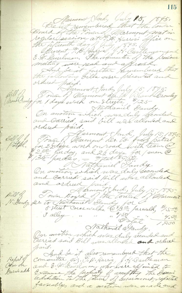 Marmont, Ind.July 15. 1895 Be it remembered that the town Board of the Town of Marmont, met in regular session at T. B. Harris office on the fifteenth day of July 1895 Present T. B. Harris, J. H. Castleman and E. W. Geiselman The minutes of the previous meeting were read and approved And be it further rememberd that the following bill were presented and ordered paid Marmont, Ind. July 15, 1895 Town of Marmont Dr. to Frank Cromley for 1 days work on Streets, $1.25 Nathaniel Gandy, On motion which was duly seconded and carried said bill was allowed and ordered paid. Marmont, Ind. July 15, 1895 Town of Marmont Dr. to Jacob Patsel for 2 1/2 days work on road with team @ $2.50 per day and 2 1/2 days for 1 man @ $1.25 per day - Total $9.37 And be it further rememberd that the following bill were presented and ordered paid Marmont,. Ind. July 15, 1895 Town Board of town of Marmonr Dr. to Nathaniel Gandy for