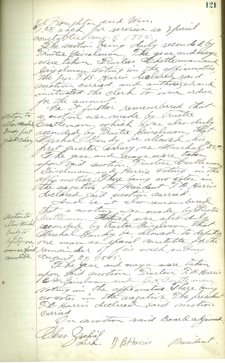 Ed Houghton and Wm. $1.25 each for sevices as special constable August 9, 1895 The motion being duly seconded by Trustee Geiselman, The yeas and nays were taken Trustees Castleman, and Geiselman voting in the affirmative the Pres. T. B. Harris declared said motion carried, and authorized and instructed the clerk to issue orders for the amount. Be it further remembered that a motion was made by trustee Castleman which was also duly seconded by Trustee Geiselman that Marshall Gandy be allowed his first quarter salary as Marshall $25.00 The yeas and nays were taken upon said motion. Trustees Castleman and Geiselman and Harris voting in the affirmative. There being no votes in the negatice, the president T. B. Harris declared said motion carried. And be it remembered that a motion was made by Trustee Castleman which was also duly seconded by trustees Geiselman that Marshall Gandy be allowed to deputy one man as special constable for the remainder of the far week, ending August 24, 1895 The yeas and nays were taken upon said motion. Trustees T. B. Harris, E. W. Geisellman and voting in the affirmative. There being no votes in the negative. The preident T. B. Harris declared said motion carried. On motion said Baord agjourned Chas Zechiel, Clerk T. B. Harris, President. |