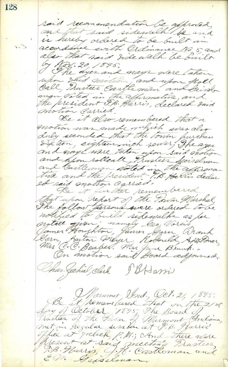 also that said side walk be built by Nov. 29, 1895 The ayes and nays were taken upon said motion and upon roll call, Trustees Castleman and Geiselman voted in the affirmative, and the resident T. B. Harris, declared said motion carried. Be it rememebred that a motion was made which was also duly seconded that the town purchase sixteen, eighteen inch sewer, The ayes and naus were taken upon said motion and upon roll call Trusteees Geiselman and Castleman voted in the affirmative and the president T. B. Harris declared said motionj carried Be it further remembered that upon report of the Town Marshall the follow persons were ordered to be notified to build sidewalks as per notice given namely