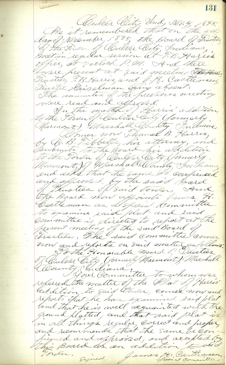 Culver City, Ind. Nov. 4 1895 Be it remembered that on the 4th day of November 1895, the Board of Trustees of the Town of CUlver City, Indiana met in regular session at T. B. Harris; office, at 7 o'clock P. M. And there were present at said meeting tustees T. B. Harris, and J. H Castleman; Trustee Geisleman being absetn. The minutes of the previous meeting were read and appreved In the matter of Harris' Addition to the Town of Culver City (formerly Marmont) Marshall county Indiana Comes now Thomas B. Harried by C. N. Tibbetts, his attorney, and submits to the Board his addition to the Town of Culver City (formerly Marmont) of Marshall county Indiana and asks that the same be confirmed and approved by said board of Trustees of said town And the Board now apponts James H. Castleman as a special committiee to examine said plat and said committes is directed to report at the presetn meeting of the said board of Trustees. The said committee comes now and reports on said matter as follows: