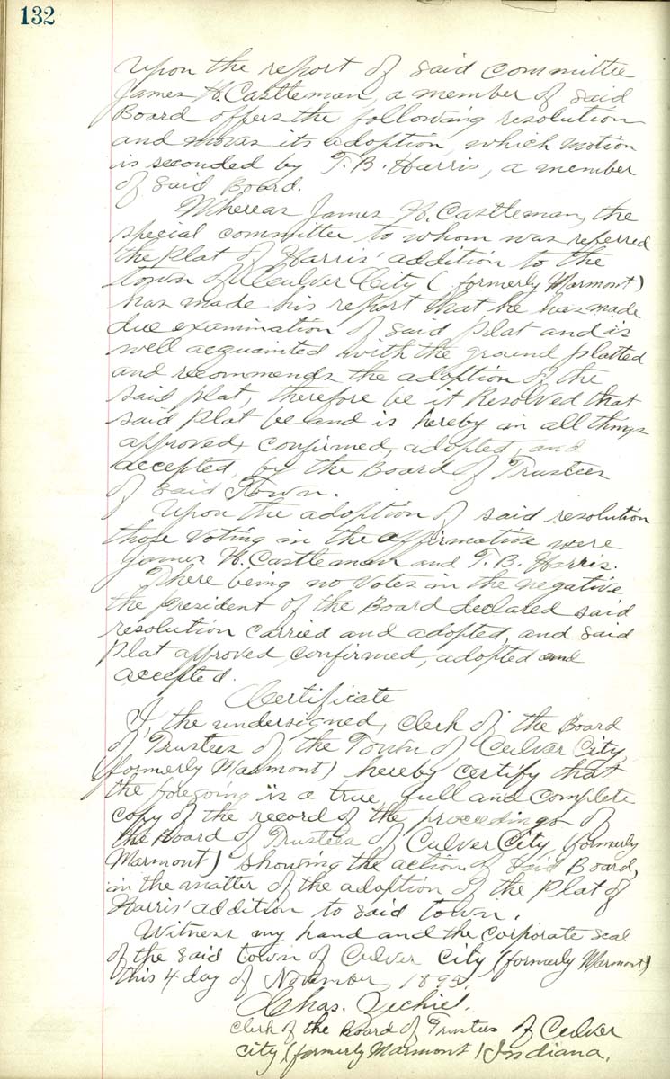 moves its adoption which motion is seconded by T. B. Harris, a member of said board Whereas James H. Castleman, the special committe to whom was referred the plat of Harris' Addition to the town of Culver City (formerly Marmont) had made by his report that he has made due examination of said plat and is will acquainted with the ground platted and recommends the adoption of the said plat be and is hereby in all things accepted by the board of Trustees of said Town. Upon the adoption of said resoultion those voting in the affirmative were James H. Castleman and T. B. Harries. There being no votes in the negative the president of the Board declared said reolution carried and adopted and said plat approved confirmed, adopted and accepted. Certificate