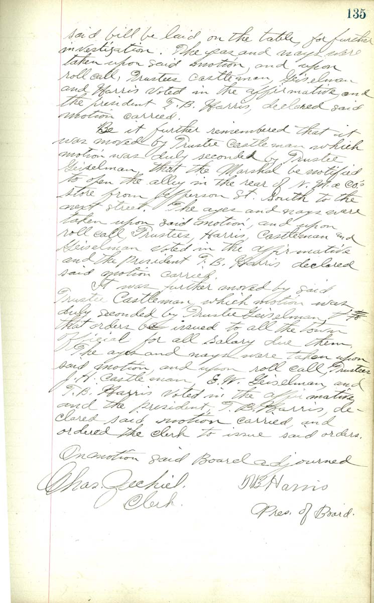 T. B. Harris, declared said motion carried Be it further remembered that it was moved by Trustee Castleman which motion was duly seconded by Trustee Geisleman that the Marshall be notiefied to open the alley in the rear of N. M. & Co's store from Jefferon St. south to the next stre. The ayes and nays were Taken upon said motion and upon roll call, Trustees Harris, Castleman and Geiselman voted in the affirmative and the president T. B. HArris declared said motion carried It was further moved by said Trustee Castleman which motion was duly seconded by Trustee Geiselman, that orders be issued to all the town offical for all salary due them. The ayes and nayswere taken upon said motion and upon roll call, Trustee J. H. Castleman, E. W. Geiselman and T. B. Harris voted in the affirmative and the president, T. B. Harris, declared said motion carried and ordered the clerk to issue said orders On motion said Board adjorned Chas Zechiel, Clerk T B Harris Pres of Board |