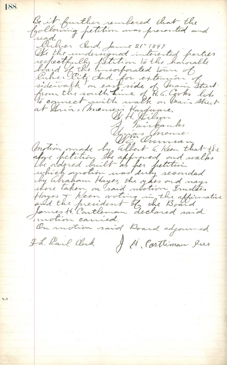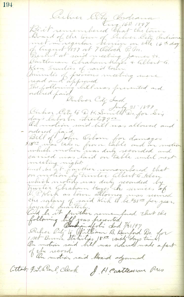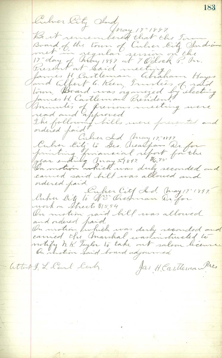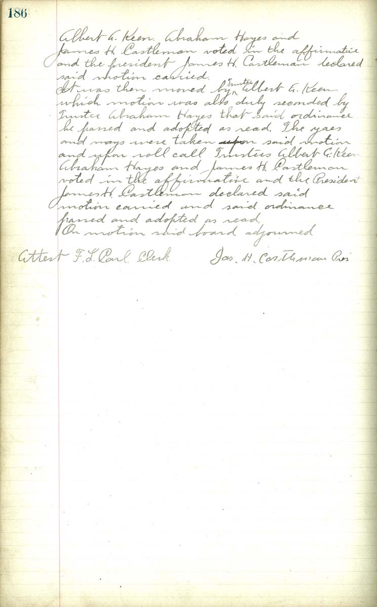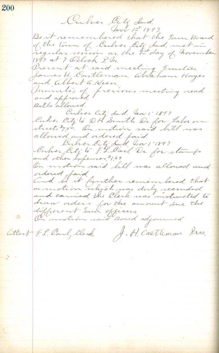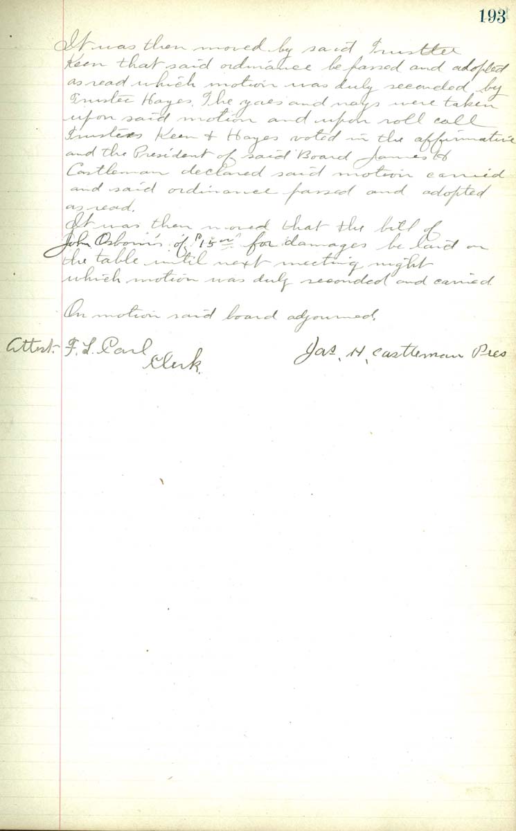 Attest: F. L. Carl, Clerk J. H. Castleman Pres. |
