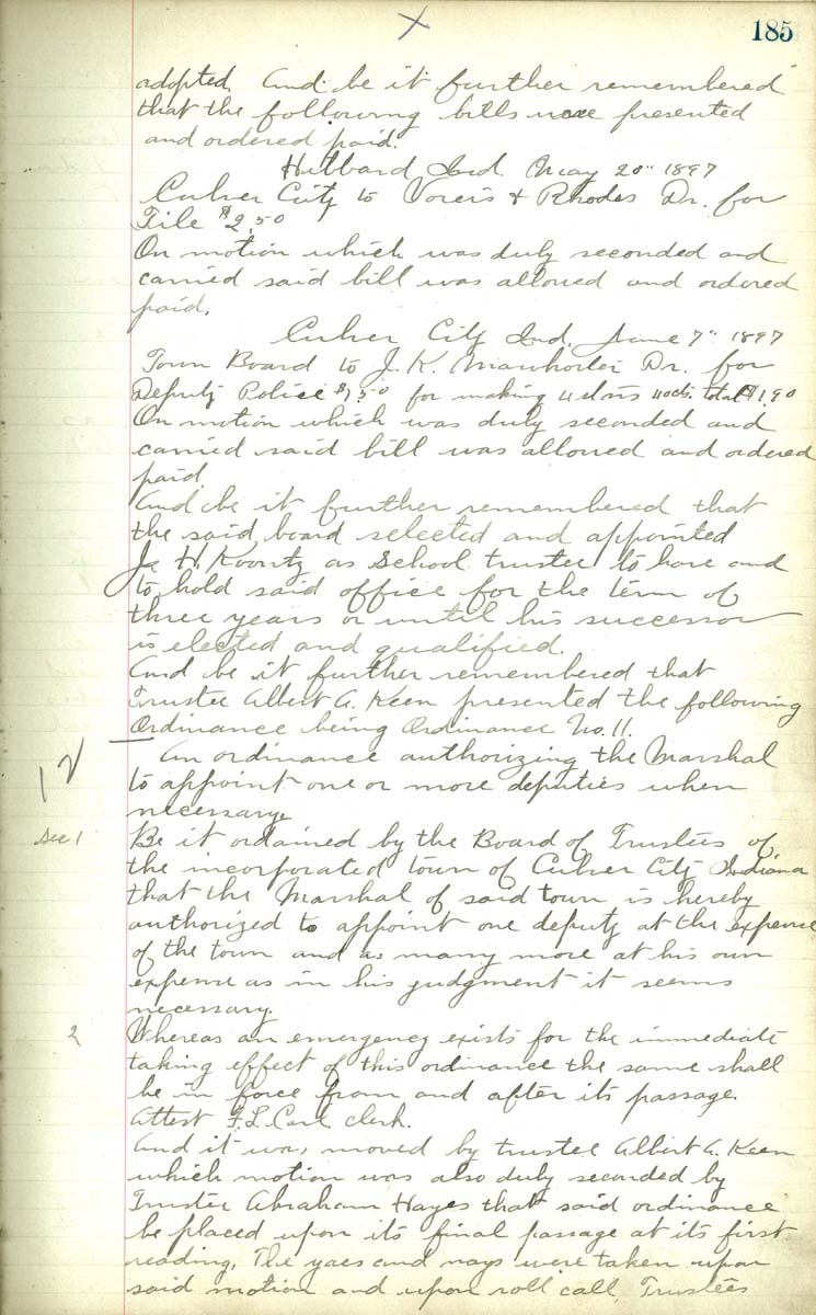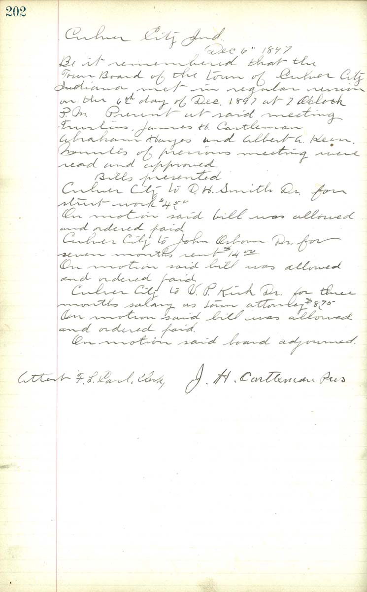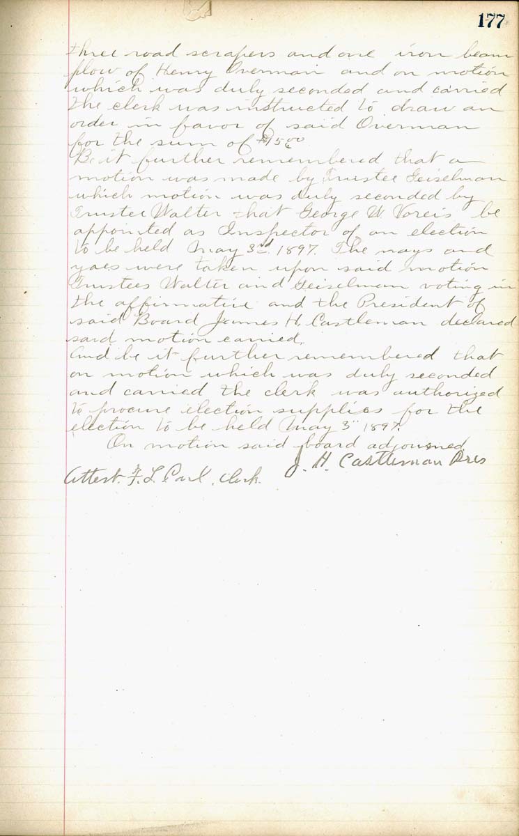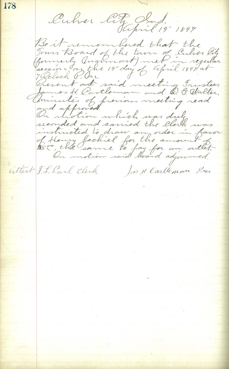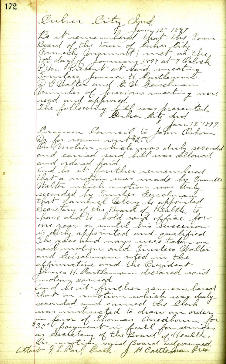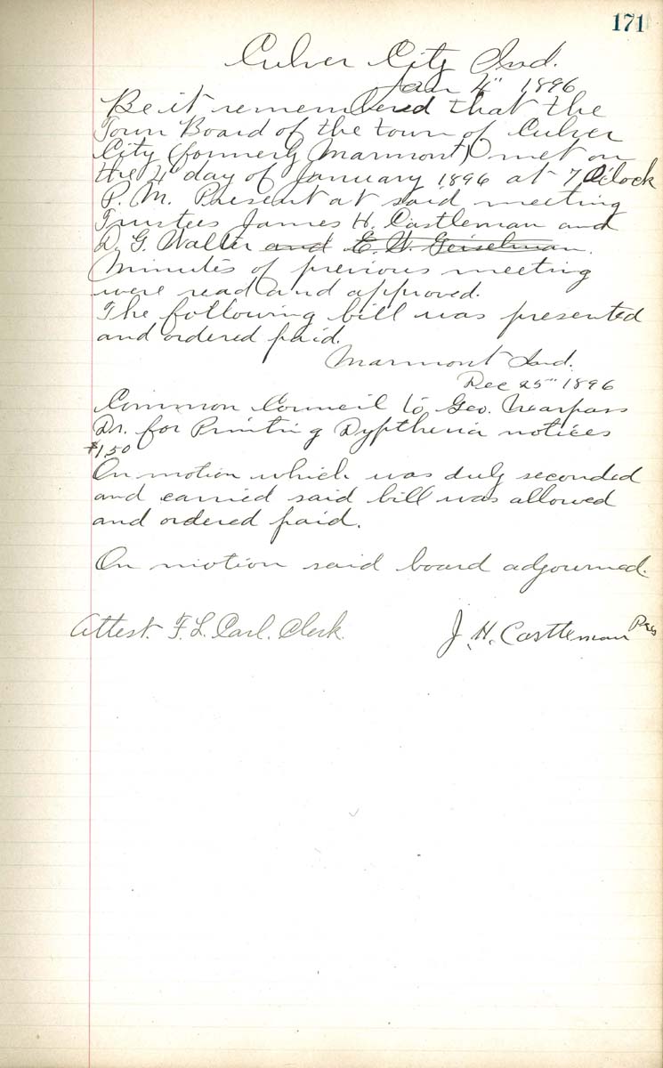 Attest: F. L. Carl, Clerk J. H. Castleman Pres. |