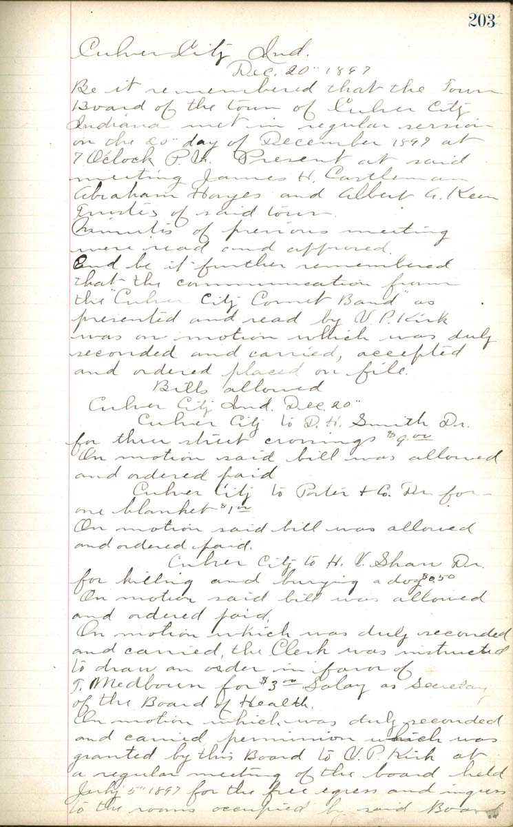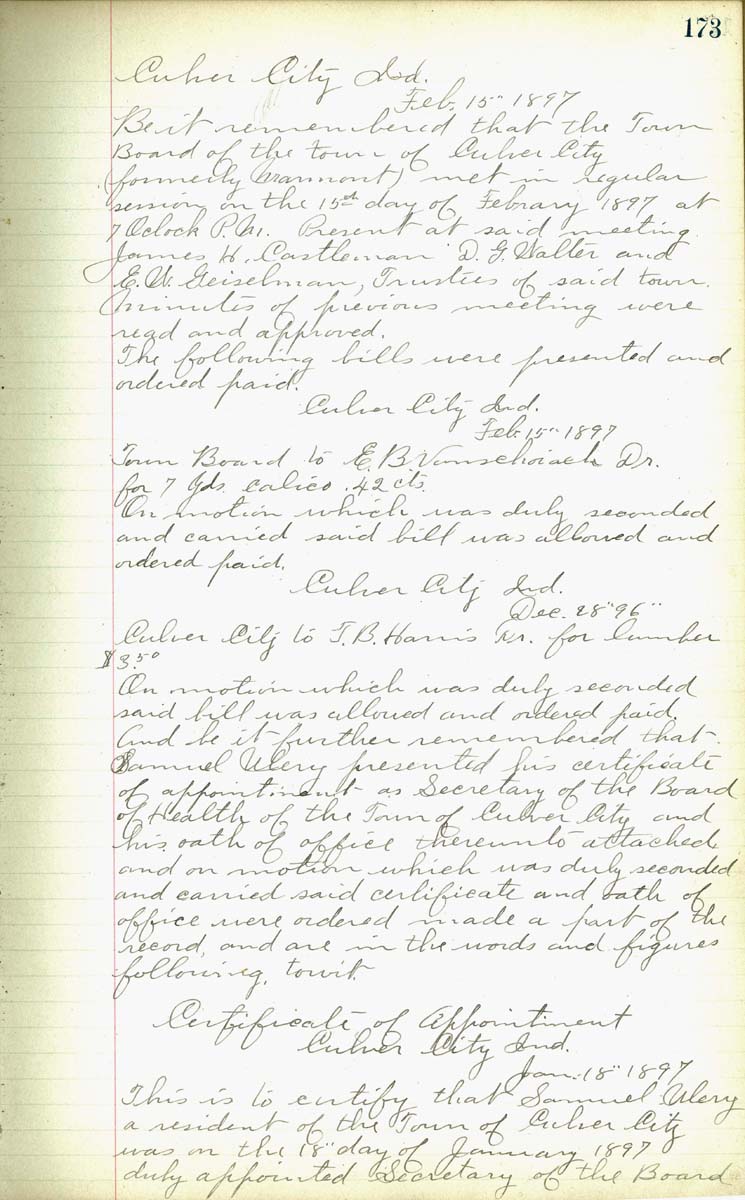 appointment as Secretary of the Board of Health of the Town of Culver City Indiana