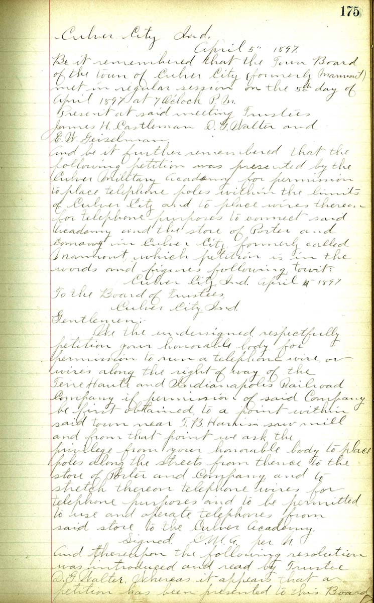 Therefore be it resolved by the Board of Trustees of Culver Indiana that permission be and