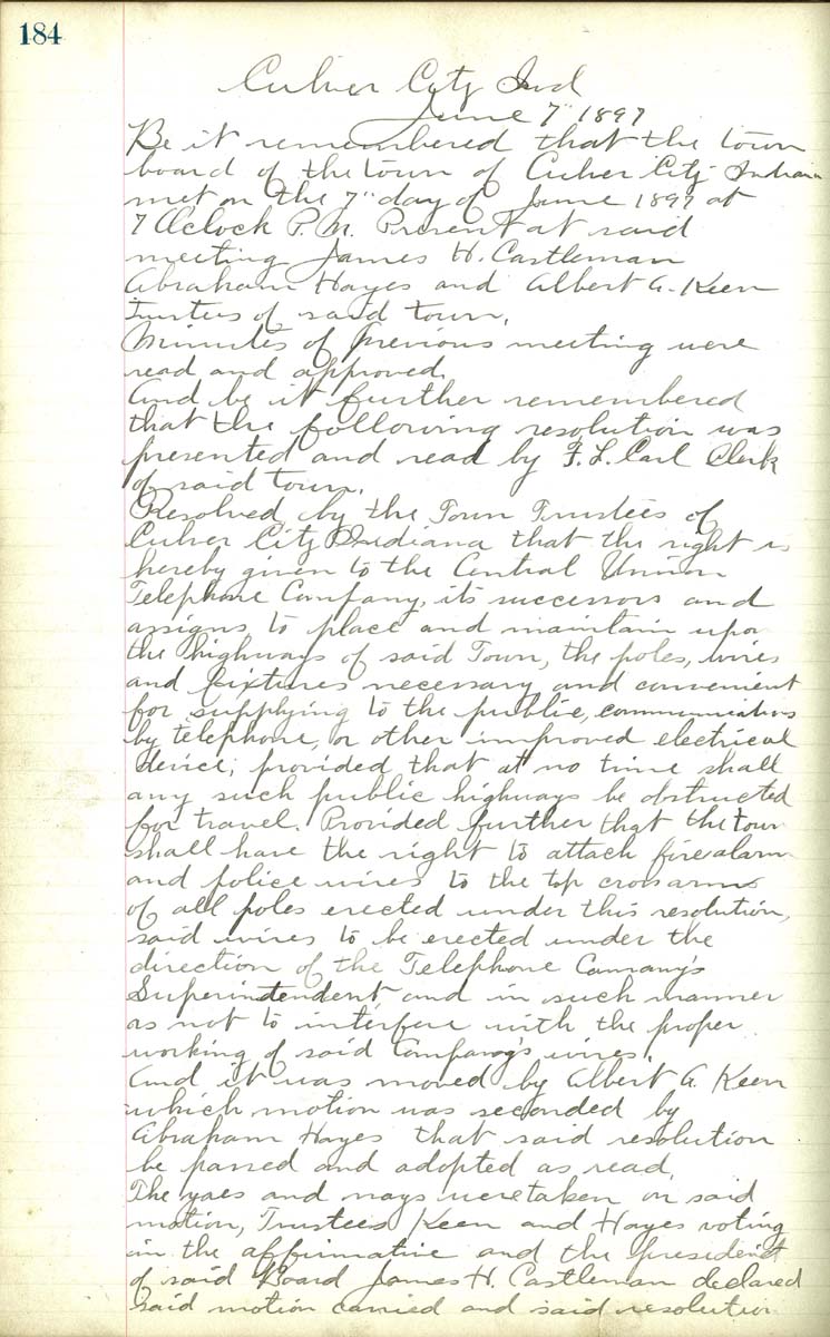 Attest F. L. Carl Clerk J. H. Castlelman Pres. |