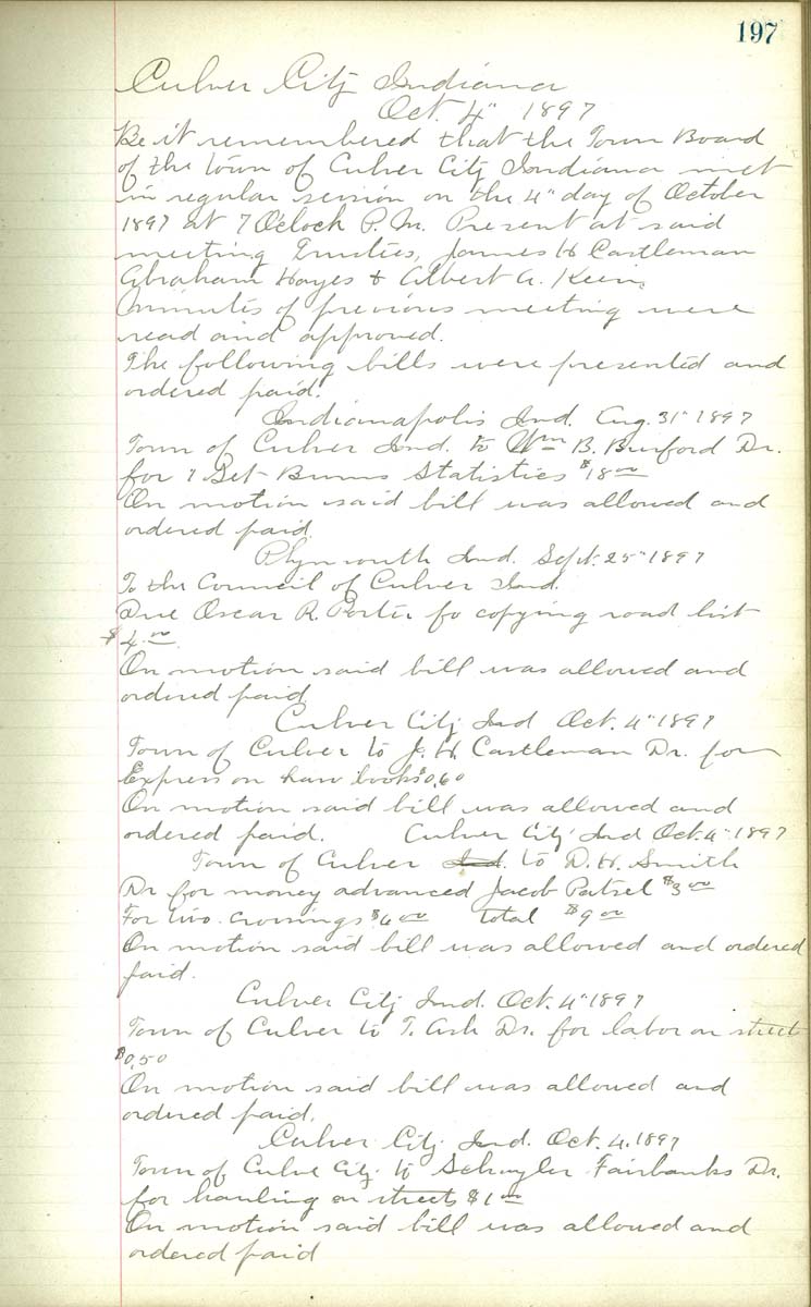 Be it remembered that the Town Bord of the town of CUlver City Ind. met in regular session on