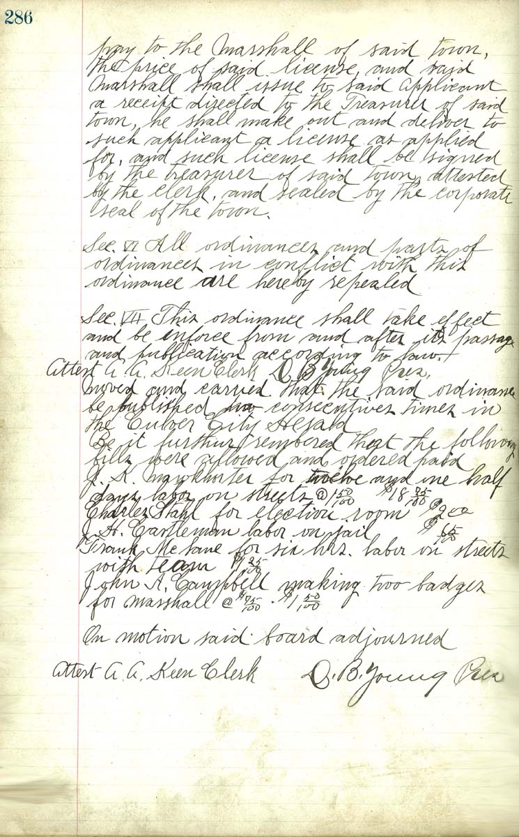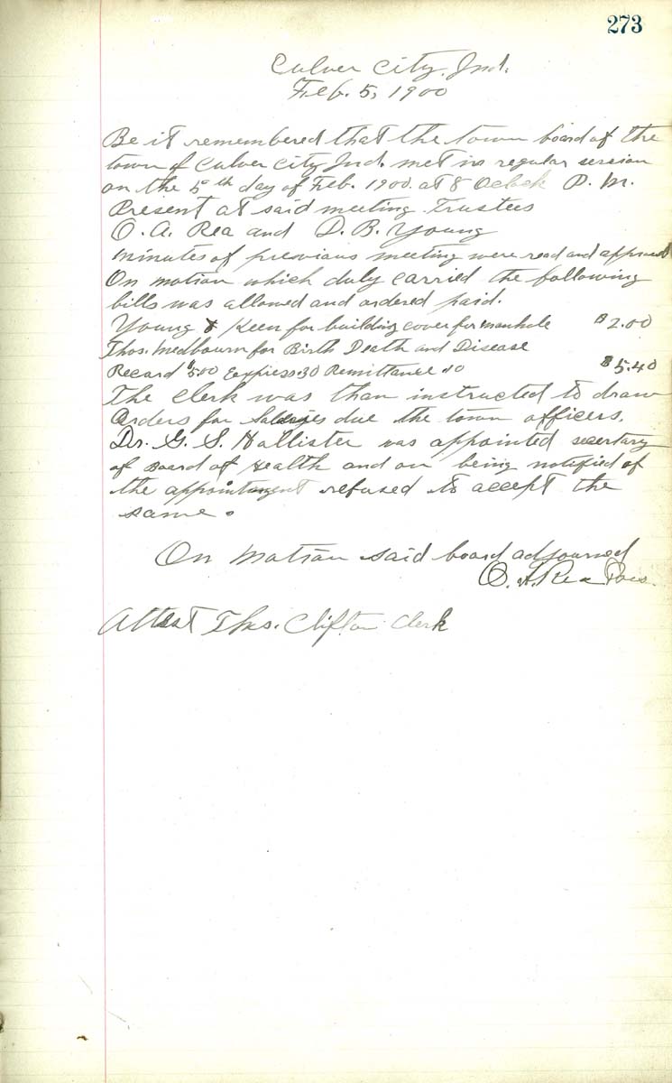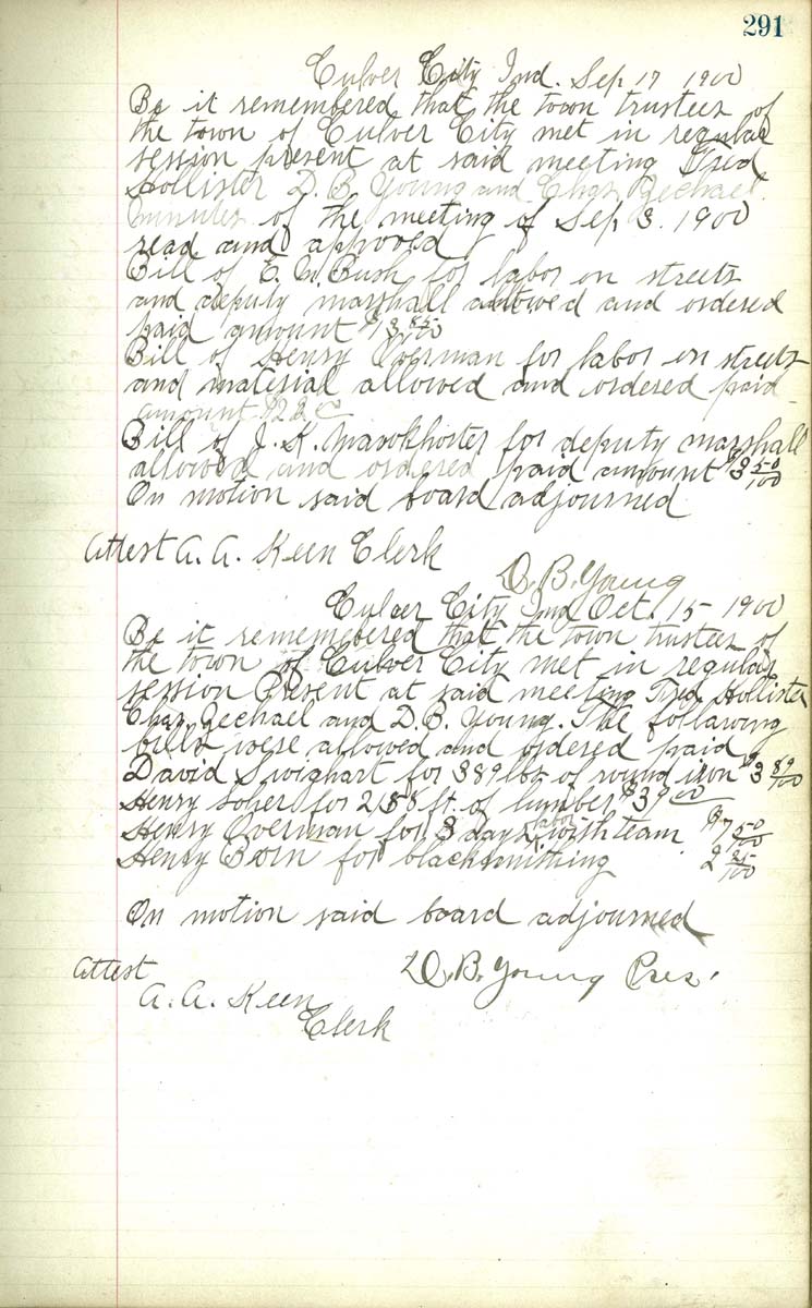 Be it remebered that the town board of the town of Culver City, Ind. met in regular sessions