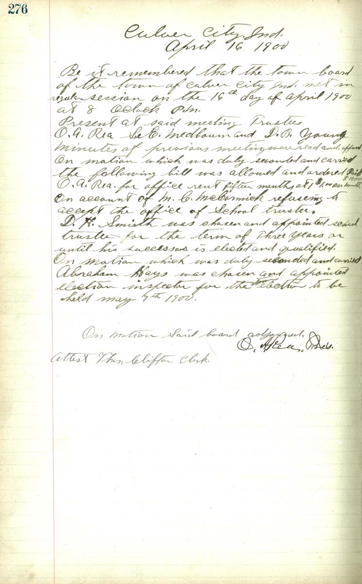 Be it rmembered that the town board of the town of Culver City, Ind. met in regular session