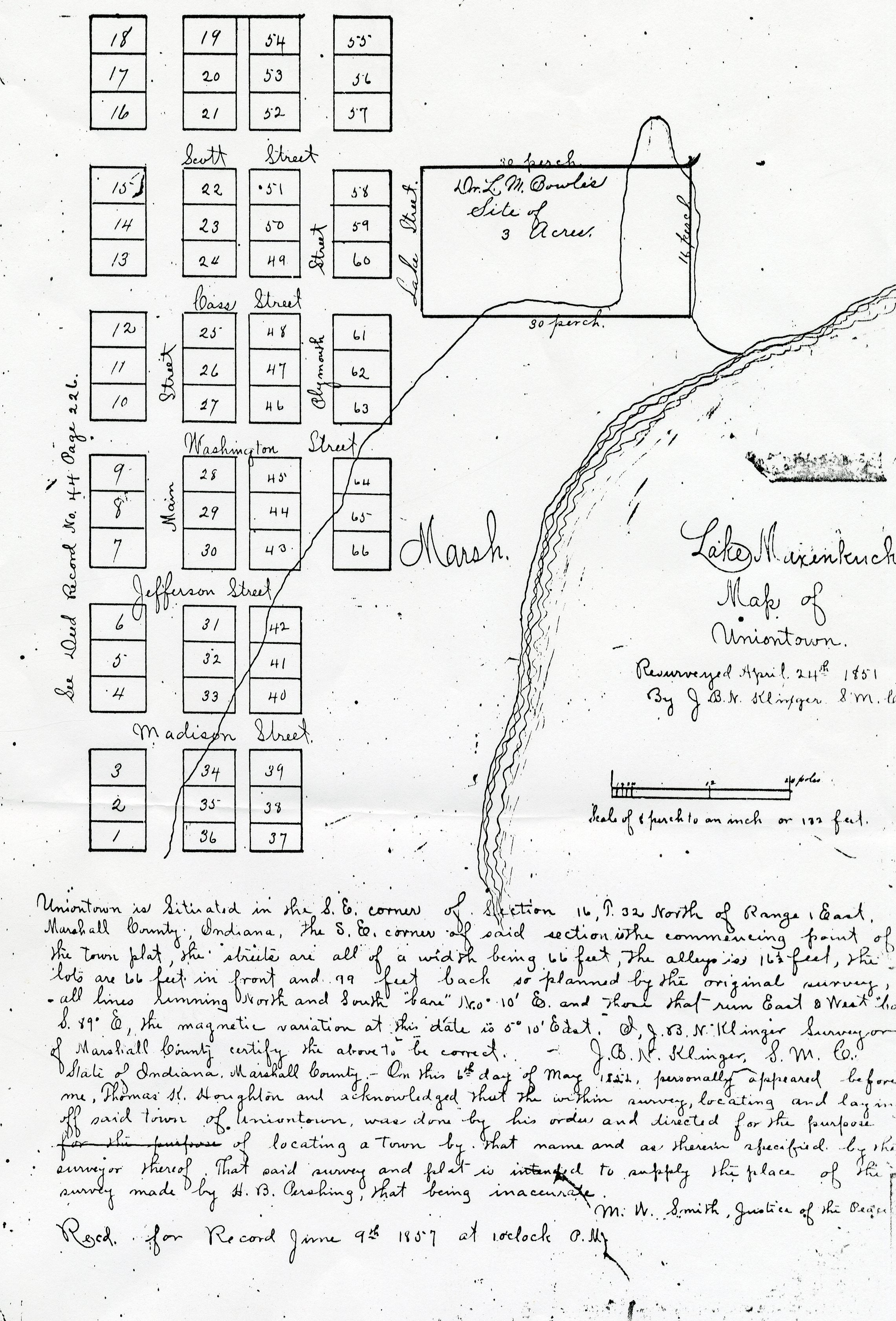 'Uniontown is situated in the S. corner of 16-32-1.E. Marshall County, Indiana, the
