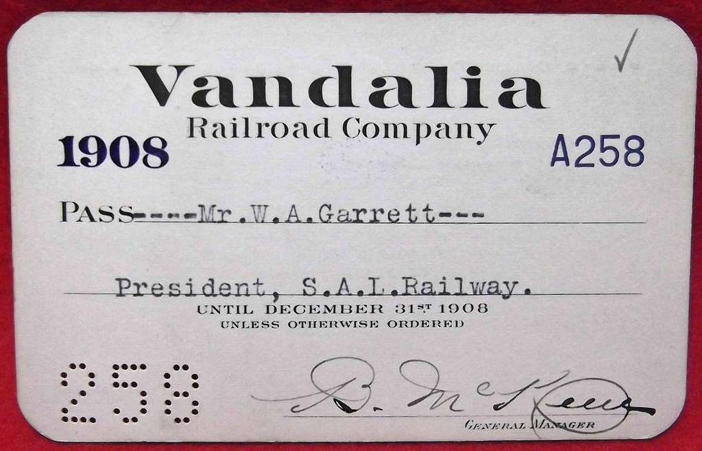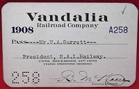A railroad pass from the Vandalia Railroad in 1908. The holder was president of S